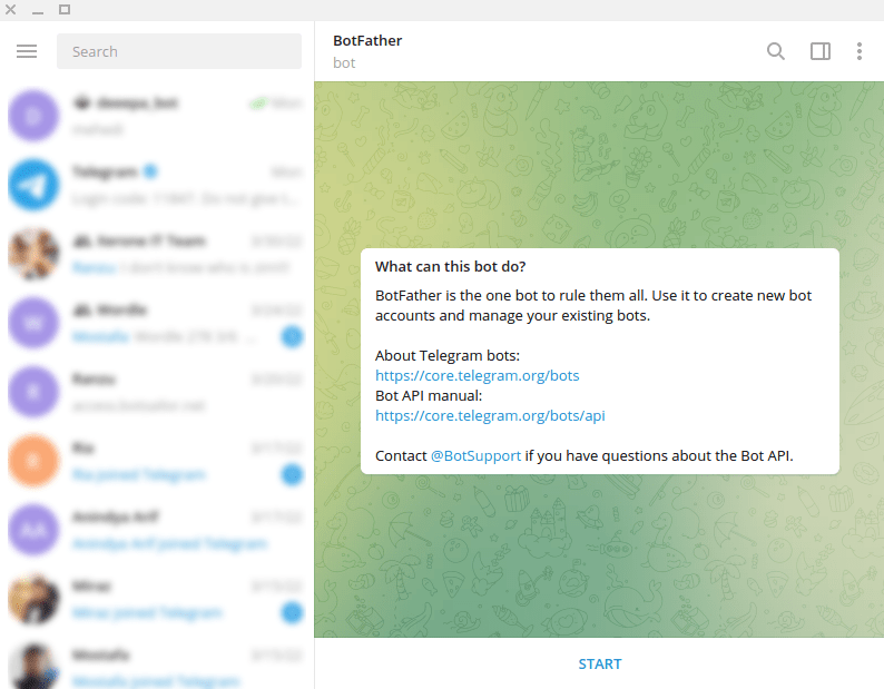 To build a Telegram bot with JanaBot, first, open your Telegram App. Then in the search bar of the app, search with the ‘BotFather’ keyword. Then select the verified BotFather account.